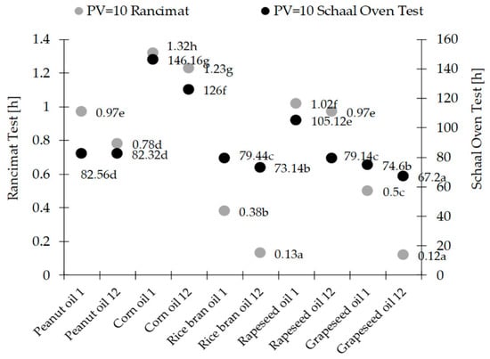 Time to reach peroxide (PV) = 10 in selected oils in the Rancimat and Schaal Oven Test in the 1st and 12th months of storage. Different small letters indicate statistically significant differences at the level p < 0.05 between oils in one test.