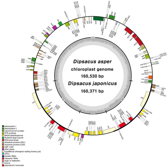 The circular gene map of Dipsacus asper and D. japonicus. The genes drawn inside the circle are transcribed clockwise, whereas those drawn outside the circle are transcribed counterclockwise. Dark gray shading inside the inner circle represents the GC content. LSC: large single copy; IR: inverted repeat; SSC: small single copy; GC: guanine-cytosine; ORF: open reading frame.