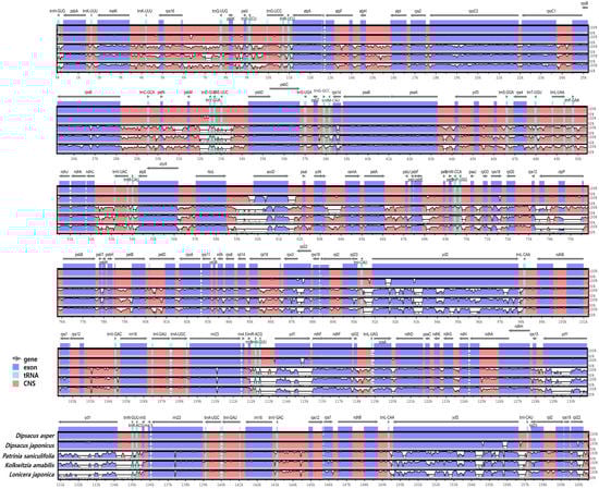 The comparative analysis of chloroplast genomes of species within the family Caprifoliaceae using mVISTA. Blue indicates conserved genes, light blue indicates tRNA and rRNA, red indicates conserved non-coding sequences (CNS), and white represents divergent regions. A cut-off of a 50% identity was used for the plots. The Y-axis represents 50–100% identity.