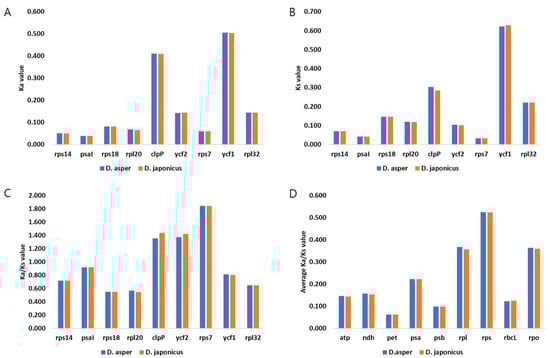The analysis of Ka, Ks, and Ka/Ks values of the chloroplast genomes of D. asper, D. japonicus, and L. japonica. The ratio of non-synonymous substitution rate (Ka) to synonymous substitution rate (Ks) was calculated for 78 conserved protein-coding genes. (A) Ka values of genes with Ka/Ks > 0.5. (B) Ks value of genes with Ka/Ks > 0.5. (C) Ka/Ks values of specific genes. (D) Average Ka/Ks values of gene groups.