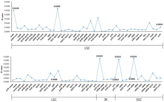 To examine divergence at the sequence level in D. asper and D. japonicus, we estimated the Pi (Figure 4). A total of 81 regions with a Pi value greater than zero were classified as coding, non-coding, and IGS. Single copy regions (LSC and SSC) were more variable than the IR regions. The average Pi values for the single copy regions was 000054 and 0.0065 for the IR regions. Genic regions were more conserved than the IGS region. The ycf2-trnL region showed the highest Pi value of 0.0325. Among the protein-coding genes, clpP showed the highest Pi value and was highly variable in the two Dipsacus species, indicating the positive selection in Caprifoliaceae. Although the CP genomes of D. asper and D. japonicus showed a highly conserved structure, the intergenic regions and a few coding regions diverged. In the chloroplast genomes of angiosperms, the intergenic regions have a higher representation than the genic regions [49].