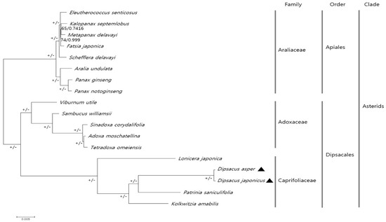 The CP genomes have been successfully used in numerous phylogenetic studies of angiosperms. Using the chloroplast genomes is advantageous, as these are more accurate and have a greater resolution than a few cp loci and nuclear rDNA ITS regions [50,51]. We investigated the phylogenetic relationship among 18 species in the families Caprifoliaceae and Adoxaceae within the order Dipsacales, and in the family Araliaceae within the order Apiales using the maximum likelihood (ML) and Bayesian inference (BI). Sequences of 69 CP protein-coding genes from all 18 species were aligned (alignment length = 58,243 bp) (Figure 5). Most nodes showed 100% ML bootstrap values and 1.0 BI posterior probabilities, except for two nodes in Araliaceae. All 18 species have been shown to cluster according to the APG IV system [52]. P. saniculifolia formed a sister group with two Dipsacus species, and. L. japonica showed a distinct phylogenetic relationship to the other four species in Caprifoliaceae. The phylogenic tree reconstructed in this study was clearly consistent with those in previous studies [53,54,55]. Previous studies used the ITS/ITS2 region or other CP loci to understand the phylogenetic relationship among the Caprifoliaceae or Dipsacales species [53,54,55]. Despite the few CP genomes applied in this study, this is the first report of phylogenetic analysis of the genus Dipsacus using protein-coding genes in the CP genome. These data provide an improved phylogenetic relationship among the species within Caprifoliaceae, supported by strong bootstrap values.