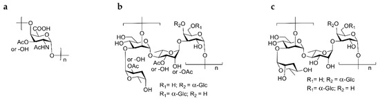 Structures of the repeat units of the trivalent Salmonella glycoconjugate vaccine components. (a) S. Typhi Vi capsule polysaccharide; (b,c) O polysaccharide repeats from (b) S. Typhimurium (serogroup B) and (c) S. Enteritidis (serogroup D) O polysaccharides. Adapted from references [1,14].