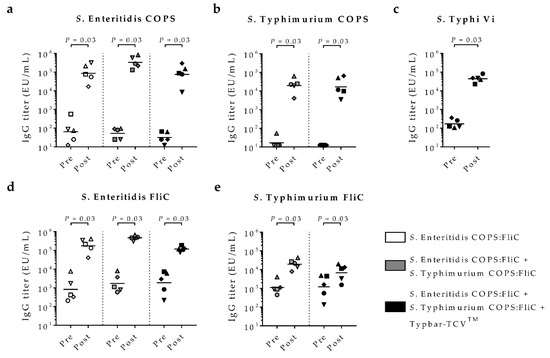 Serum IgG responses in rabbits immunized with Salmonella conjugate formulations. New Zealand White rabbits (n = 5/group) were immunized intramuscularly with monovalent S. Enteritidis coupled core-O polysaccharide (COPS) and phase 1 flagellin protein (FliC) (COPS:FliC) (white shapes), a bivalent nontyphoidal Salmonella (NTS) co-formulation (S. Enteritidis COPS:FliC + S. Typhimurium COPS:FliC, grey shapes), or a trivalent typhoid-iNTS co-formulation (S. Enteritidis COPS:FliC + S. Typhimurium COPS:FliC + S. Typhi Typbar-TCV™, black shapes). Baseline or day 14 post-third immunization sera were assessed for IgG titers by ELISA against (a) S. Enteritidis COPS; (b) S. Typhimurium COPS; (c) S. Typhi Vi; (d) S. Enteritidis FliC; or (e) S. Typhimurium FliC. Points represent sera from individual rabbits, bars indicate the geometric mean titer. Comparisons between groups were accomplished by 1-tailed Wilcoxon matched-pairs signed rank test, for which p-values are indicated.