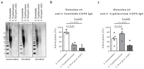 Epitope mapping of serum IgG from rabbits immunized with Salmonella glycoconjugates. Sera were assessed for binding by (a) Western blot of crude lipopolysaccharide (LPS) extracts from S. Enteritidis R11, S. Typhimurium I77, or S. Newport Chile 361 ∆rfaL using pooled rabbit sera (n = 5) obtained after immunization with S. Enteritidis COPS:FliC (monovalent), S. Enteritidis COPS:FliC + S. Typhimurium COPS:FliC (bivalent), or S. Enteritidis COPS:FliC + S. Typhimurium COPS:FliC + S. Typhi Typbar-TCV™ (trivalent) formulations; (b,c) Adsorption of anti-S. Enteritidis COPS IgG (b) and anti-S. Typhimurium COPS IgG (c) from pooled post-vaccination trivalent sera (day 14) by S. Enteritidis R11, S. Typhimurium I77, or S. Newport Chile 361 ∆rfaL. Percent adsorption was calculated relative to samples treated with bovine serum albumin (BSA). Each point indicates an individual rabbit serum sample (n = 5), and bars represent the mean. Groups were compared using a 1-tailed Wilcoxon matched-pairs signed rank test for which p-values are indicated.
