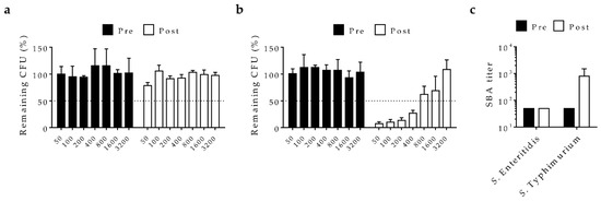 In order to determine whether conjugate-induced antibodies could cause functional antibacterial activity, complement-mediated serum bactericidal activity (SBA) was assessed with different dilutions of pooled post-vaccination sera from rabbits immunized with the trivalent vaccine formulation compared to paired pre-immune sera (Figure 4). Incubation with pre-immune sera had no impact on S. Typhimurium D65 or S. Enteritidis S15 colony forming units (CFU) compared to incubation with complement alone. By comparison, trivalent vaccine-induced sera mediated robust bactericidal activity for S. Typhimurium, with a calculated SBA titer of 800. S. Enteritidis were only weakly killed, however, by post-vaccination sera, for which maximal killing of only ~20% of viable cells was seen at the lowest dilution tested and no increase in the endpoint titer was obtained.