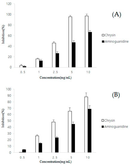 Figure 1. Inhibitory effect of various chrysin concentrations on amadori compound (A) and AGEs formation (B). Aminoguanidine is the positive control for AGEs.