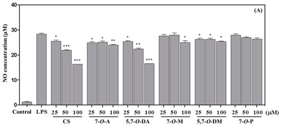 The effect of CS and its derivatives on LPS-induced inflammation in RAW 264.7 cells was also investigated, and NO concentration was used as a biomarker to indicate the degree of cellular inflammation. Figure 2A shows the effects of CS, 7-O-A, 5,7-O-DA, 7-O-M, and 5,7-O-DM against NO production in LPS-induced RAW 264.7 cells.