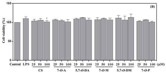 Moreover, treatment with 5,7-O-DA resulted in the concentration-dependent inhibition of NO in LPS-induced RAW 264.7 cells, and its effect was similar to that of CS. The cell viability effect of CS and derivatives on RAW 264.7 cells was observed by an MTS assay. The concentration of NO in the supernatant increased after LPS treatment, and no compounds exhibited cytotoxicity at concentrations between 25 to 100 μM after 24 h (Figure 2B).