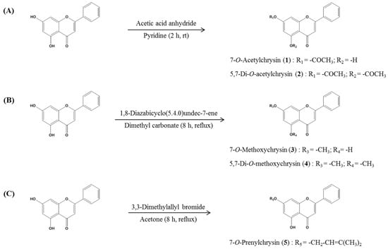 Figure 4. Scheme for synthesis of O-acetylation (A), O-methylation (B), and O-prenylation (C) from chrysin used in this study.
