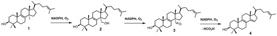 SDM, also known as P45014DM or CYP51, catalyzes the removal of the C-32 methyl group of lanosterol (1) via a repetitive three-step process that uses reduced nicotinamide adenine dinucleotide phosphate (NADPH) and oxygen (Figure 2) to ultimately produce 4,4-dimethyl-5α-cholesta-8,14,24-trien-3β-ol (4) [22,23]. SDM transforms the C-32 methyl group of lanosterol into an alcohol (2), an aldehyde (3), and then formic acid with the insertion of the Δ14–15 double bond (Figure 2) [24]. Each P450 catalytic cycle involves the reduction of heme ferric iron to the ferrous state, the binding of molecular oxygen, and subsequent protonation to form a ferric hydroperoxo intermediate [24]. Further protonation of the distal oxygen atom of the ferric hydroperoxo intermediate causes heterolytic scission of the O–O bond, resulting in the loss of water and the formation of an Fe4+ oxo porphyrin cation radical, which is the catalytically active species [24]. Once the substrate is oxygenated, the iron returns to its ferric state ready for another catalytic cycle [24].