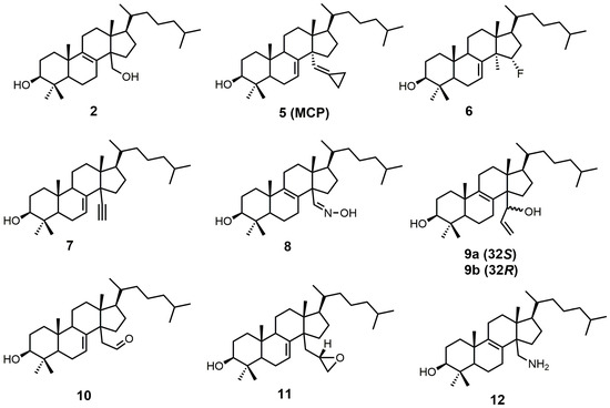 Sterol-based SDM inhibitors have been reported in the literature [22,23,24,25,26,27,28,29,30] (Figure 3); however, they are not as commonly reported as azoles [12,17,31,32,33,34,35,36,37,38,39,40,41,42,43,44,45,46]. This is likely due to the limited number of functional groups on lanosterol that can be synthetically modified [47], in addition to the difficult and time-consuming syntheses involved with sterol functional-group manipulation. The preferred substrate of SDM is compound 2, which is the most potent natural inhibitor of SDM [25]. Compound 2 has a half-maximal inhibitory concentration (IC50) value of 7.8 μM against SDM, and it can be made synthetically in nine steps starting from lanosterol [25,48].