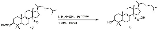 Lanost-8-en-32-alkoxime-3β-ol (8) was reported as having an IC50 value of 1.1 μM against SDM [25]. Compound 8 was readily prepared from 3β-benzoyloxy-lanost-8-en-32-al (17) in two steps (Figure 7) [52]. The aldehyde functional group of compound 17 was converted into an oxime by the use of hydroxylamine hydrochloride in pyridine [52]. The benzoyl protecting group was removed using potassium hydroxide in ethanol to yield compound 8 [52].