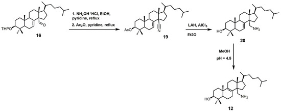4,4-Dimethyl-14α-aminomethyl-cholest-8-en-3β-ol (12) and 4,4-dimethyl-14α-aminomethyl-cholest-7-en-3β-ol (20) were observed to be active against T. cruzi SDM with apparent Kd values of 5.1 and 1.3 μM, respectively [30]. These two amino derivatives have around a 3-fold stronger inhibitory effect on Candida albicans SDM in comparison to T. cruzi SDM and produce IC50 values of around 4 μM against C. albicans growth [30]. 4,4-Dimethyl-14α-aminomethyl-cholest-8-en-3β-ol (12) can be synthesized starting with compound 16 (Figure 10) [30]. The aldehyde functional group of compound 16 was converted into an oxime with hydroxylamine hydrochloride, which in turn was transformed into nitrile 19 with acetic anhydride and pyridine [30]. Nitrile 19 was then reduced to a primary amine with lithium aluminum hydride and aluminum trichloride to yield compound 20, which was easily isomerized into compound 12 with acidic methanol [30].