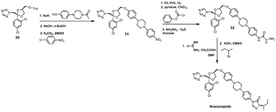 The synthesis of itraconazole can be started by reacting compound 30 with sodium hydride and 1 acetyl-4-(4-hydroxyphenyl)piperazine to yield cis-1-acetyl-4-[4-[[2-(2,4-dichlorophenyl)-2-(1H-1,2,4-triazol-1-ylmethyl)-1,3-dioxolan-4-yl]methoxy] phenyl]-piperazine (Figure 15) [34]. The N-acetyl group can be removed by sodium hydroxide, and the unprotected piperazine nitrogen under basic conditions with potassium carbonate can undergo a nucleophilic aromatic substitution with p-chloronitrobenzene to yield compound 31. The aromatic nitro group was reduced to an aniline functional group with hydrogen gas and 5% platinum on carbon, and the aniline derivative was converted into a carbamate with phenyl chloroformate [34]. Reacting the carbamate with hydrazine produced the hydrazine carboxamide 32. Compound 32 was initially treated with formamidine acetate and then with 2-bromobutane in the presence of potassium hydroxide to yield itraconazole (Figure 15) [34].