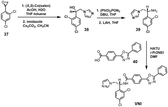 VNI can be synthesized in five steps that are scalable to multi-gram quantities with >98% purity as needed for in vivo animal studies (Figure 17) [84]. The racemic epoxide (37) was resolved with (S,S)-Co(salen) and then opened with imidazole under basic conditions to yield compound 38 [84]. Compound 38 was reacted with diphenylphosphoryl azide to replace the secondary alcohol with an azide group and was subsequently reduced with lithium aluminum hydride to yield amine 39 [84]. VNI was obtained by reacting compounds 39 and 40 under amide bond coupling conditions with 1-[bis(dimethylamino)methylene]-1H-1,2,3-triazolo[4,5-b]pyridinium 3-oxide hexafluoro-phosphate (HATU) [84].