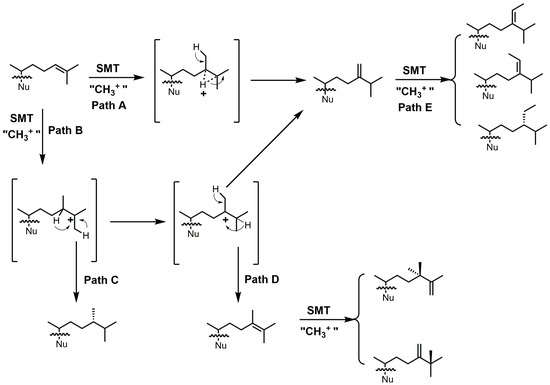 24-SMT catalyzes a methylation–deprotonation reaction that involves electrophilic alkylations of a double bond at C-24 by a methyl cation originating from S-adenosyl methionine (SAM) (Figure 18) [4]. The majority of characterized 24-SMTs are multifunctional and possess a very high substrate specificity, often yielding only a single C-24 methylated olefin product; however, there are a few atypical 24-SMTs that convert substrates to a variety of 24-alkyl(idene) products including T. brucei SMT1 and Glycine max SMT1 [4]. The various pathways possible with 24-SMT catalysis are outlined in Figure 18.