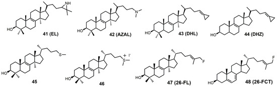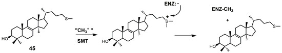 Another class of 24-SMT inhibitors comprises sulfur-containing sterols such as 25-thialanosterol (45) and 25-thialanosterol iodide (46) (Figure 19) [103]. 24-SMT from C. albicans was irreversibly inhibited with 25-thialanosterol with a Ki value of 5 μM and an apparent kinact value of 0.013 min−1, while the corresponding sulfonium salt was a reversible transition-state inhibitor with a Ki value of 20 nM [103]. 24-Thialanosterol was observed to inhibit C. albicans 24-SMT with an IC50 value of 20 μM [3]. 25-Thialanosterol iodide has a Ki value of 86 nM against T. brucei 24-SMT and an ED50 value of 2 μM against both the procyclic and bloodstream forms of the T. brucei parasite [2]. 24-SMT can methylate the 25-sulfur atom of 25-thialanosterol to form a sulfonium cation that can act as a methyl donor to irreversibly methylate SMT (Figure 26) [4].