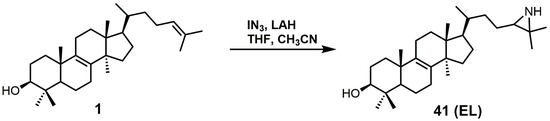 EL was observed to have a Ki value of 49 nM against T. brucei 24-SMT [88]. An amastigote form of T. cruzi proliferating in a liver infusion tryptose medium was treated with EL, and growth was completely arrested; lysis occurred at an EL concentration of 6 μM [89]. EL was recently reported as an inhibitor of Acanthamoeba spp. trophozoite growth with an IC50 value of 7 nM, and in this study, EL yielded 20-fold higher inhibition compared to the reference drug voriconazole [90]. EL exhibited tight biding against both 24- and 28-SMT with Ki values of around 9 nM [90]. EL (41) can readily be synthesized directly from unprotected lanosterol with an excess of iodine azide and the addition of LAH (Figure 22) [91].