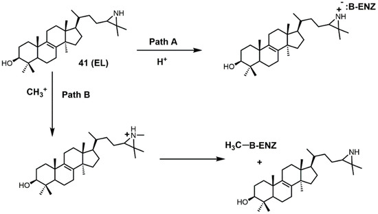 There are several different ways EL is thought to inhibit 24-SMT (Figure 23). EL could have its aziridine nitrogen atom protonated (path A) and then form an ammonium salt that can electrostatically interact with a polar amino acid in the active site of 24-SMT (such as a carboxylate group) [92]. Alternatively, EL could be methylated by 24-SMT and donate its N-methyl group to the active-site residue of 24-SMT, thereby inactivating it [92].