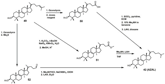 AZAL can readily be synthesized via three different synthetic routes, which are outlined in Figure 24 [4,95,96]. All three routes involve converting the Δ24–25 double bond of lanosterol into an activated carbonyl group (aldehyde, carboxylic acid, or ester) followed by nucleophilic attack with dimethylamine. Each synthetic route was completed with protecting group removal by LAH.