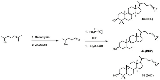 The 26,27-dehydrosterols can be prepared in a few steps starting with the 3-acetylated sterol (Figure 25). The 24–25 double bond of the corresponding sterol is transformed into an aldehyde by ozonolysis with a reductive workup [102]. The 26,27-cyclopropylidine moiety is installed via a Wittig reaction using the desired sterol aldehyde and the phosphorus ylide formed from cyclopropyltriphenylphosphonium bromide and butyllithium [102]. The acetate group was easily removed with LAH.