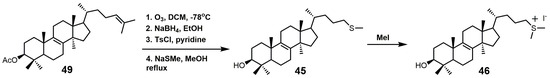 The synthesis of 25-thialanosterol (45) and 25-thialanosterol iodide (46) is outlined in Figure 27 [103]. The synthesis started with ozonolysis of acetylated lanosterol (49) to yield 3-acetoxylanosta-8,24-dienol-26-al. 3-Acetoxylanosta-8,24-dienol-26-al was then reduced with sodium borohydride to yield an alcohol that was activated as a tosylate. Methanethiolate then displaced the tosylate group to yield 25-thialanosterol (45). Treatment of 25-thialansterol with methyl iodide yielded 25-thialanosterol iodide (46).