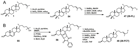 (A) Synthesis of 26-fluorolanosterol (26-FL) (47); (B) synthesis of 26-fluorocholesta-5,7,24-trienol (26-FCT) (48).