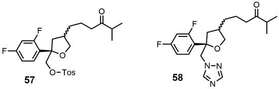 - Saksena, A.K.; Girijavallabhan, V.M.; Wang, H.; Liu, Y.T.; Pike, R.E.; Ganguly, A.K. Concise asymmetric routes to 2,2,4-trisubstituted tetrahydrofurans via chiral titanium imide enolates: Key intermediates towards synthesis of highly active azole antifungals SCH 51048 and SCH 56592. Tetrahedron Lett. 1996, 37, 5657–5660. [Google Scholar] [CrossRef]