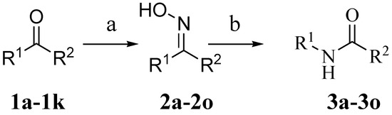 - De Luca, L.; Giacomelli, G.; Porcheddu, A. Beckmann Rearrangement of Oximes under Very Mild Conditions. J. Org. Chem. 2002, 67, 6272–6274. [Google Scholar] [CrossRef] [PubMed]