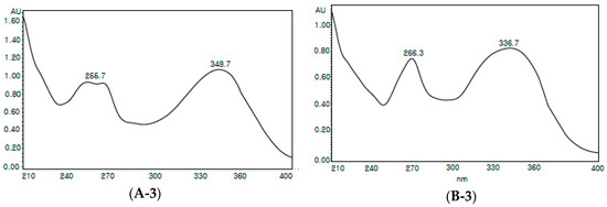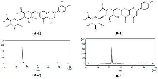 The structure and purity of luteolin-7-O-diglucuronide and apigenin-7-O-diglucuronide from Perilla frutescens var. acuta (PFA). (A-1) The structure of luteolin-7-O-diglucuronide. (A-2) HPLC profile of luteolin-7-O-diglucuronide. (A-3) The UV spectrum of luteolin-7-O-diglucuronide. (B-1) The structure of apigenin-7-O-diglucuronide. (B-2) HPLC profile of apigenin-7-O-diglucuronide. (B-3) The UV spectrum of apigenin-7-O-diglucuronide.