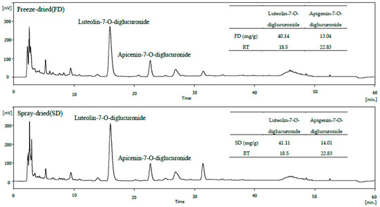 Using HPLC, we verified the difference in composition according to the two methods (freeze-drying versus spray-drying). As shown in Figure 2, the HPLC patterns of the freeze-dried and spray-dried formulations were similar. The polyphenol compounds were identified as luteolin-7-O-diglucuronide and apigenin-7-O-diglucuronide. Approximately, 40.14 and 41.11 mg/g luteolin-7-O-diglucuronide and 13.04 and 14.01 mg/g apigenin-7-O-diglucuronide were present in freeze-dried and spray-dried samples, respectively.