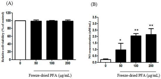 rCSMCs were treated with freeze-dried PFA at concentrations ranging from 50 µg/mL to 200 µg/mL for 24 h. There were no significant alterations in cell viability following freeze-dried PFA treatment at these concentrations (Figure 3A). Therefore, the cells were treated with 50 µg/mL, 100 µg/mL, and 200 µg/mL of the freeze-dried PFA extract to determine NO production. The freeze-dried PFA extract increased NO production compared to that in untreated cells in a dose-dependent manner (Figure 3B).
