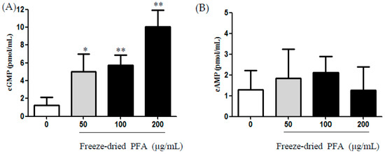 2.4. Effect of the Freeze-Dried PFA on the Production of cAMP and cGMP in rCSMCs