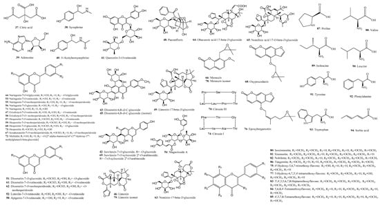 - Kuroyanagi, M.; Ishii, H.; Kawahara, N.; Sugimoto, H.; Yamada, H.; Okihara, K.; Shirota, O. Flavonoid glycosides and limonoids from Citrus molasses. J. Nat. Med. 2008, 62, 107–111. [Google Scholar] [CrossRef] [PubMed]