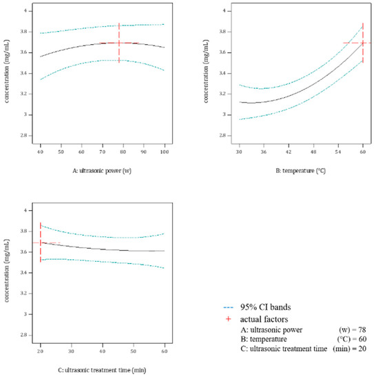 Meanwhile, the concentration of 3.832 ± 0.055 mg/mL was not only higher than concentrations of all 15 runs in Box–Behnken designs, but also higher than the concentration obtained by the optimized water extraction using the same tea tree variety, whose value was 3.325 ± 0.044 mg/mL with a significant difference (p < 0.05), indicating ultrasound could indeed improve the extraction of tea-leaf saponins.