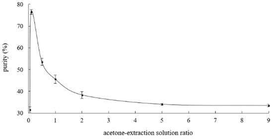 Usually, existing research focused on the investigation of the ratio between acetone or other precipitants to extraction solutions without offering the data of extraction solutions’ concentrations [29,47,48], making it difficult to compare results. A broader range of extraction solution concentrations for acquiring the corresponding optimal values of ratio deserves more attention if it is beneficial to industrial purifications.