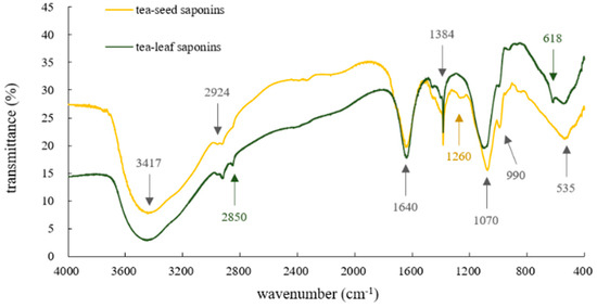 Figure 3 presents differences of tea-leaf saponins and tea-seed saponins in FT-IR spectra. Curves of tea-leaf saponins and tea-seed saponins were consistent in trend with local differences. The broad peak near 3417 cm−1 corresponded to the O–H stretching vibrations [44,55]; peaks of 2924 cm−1 and 2850 cm−1 were assigned to infrared CH2 symmetric stretching band [55,56]; and peaks 1640 cm−1, 1384 cm−1, 1260 cm−1, 1070 cm−1 and 535 cm−1 could be related to stretching vibration band of C=C in sapogenins, in-plane bending vibration of –OH, –C–O stretching vibrations of primary alcohols, and stretching vibration of C–O and C–Br [43,57,58], respectively. Peaks at 990 cm−1 and 618 cm−1 might be regarded as C–O bond stretching in the C–OH group and alkene mono-substitution, respectively, according to current literature [57]. In summary, it could be inferred that tea-leaf saponins had a stronger symmetric vibration of CHn, especially C–CH2 bonds, which indicated their composition differences in comparison with tea-seed saponins. The unique peak of tea-seed saponins at 1260 cm−1 suggested the existence of primary alcohols in tea-seed saponins.