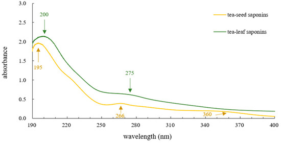 In UV spectra of tea-leaf saponins and tea-seed saponins, regardless of their differences in absorbances resulting from their distinct concentrations, the trends were consistent, as demonstrated in Figure 4. Compared with existing research [13,59,60], where the characteristic the highest peak of tea saponins was at 215 nm, peaks in this study showed shifts; for instance, the highest peak of tea-leaf saponins appeared at 200 nm while that for tea-seed saponins was 195 nm. Peaks at 266 nm and 360 nm of tea-seed saponins probably related to proteins, sugars or flavonoids in tea-seed saponins [59,60] due to their purities ranging from 10% to 25%. Nonetheless, the unique peak around 280 nm of tea-leaf saponins was regarded as the characteristic peak of tea-leaf saponins by researchers [13]. This peak was thought to be produced by the cinnamic acid [13], which only contained in tea-leaf saponins, and the strong absorption of tea saponins at 215 nm was generated from the α, β unsaturated conjugated double bonds at C-21 [60].