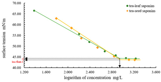 CMC is the concentration point when an amphiphilic component in solution initiates to form micelles, being essential for biosurfactant applications, as concentrations of biosurfactants above the CMC, no further effect on the surface activities is expected [55]. In the plot of the surface tension (γ) in the unit of mN/m as a function of the logarithm of concentrations (mg/L) of tea-leaf saponins and tea-seed saponins, the CMC value was determined to be the intersection point between the two fitted straight lines of the pre-CMC and post-CMC data.