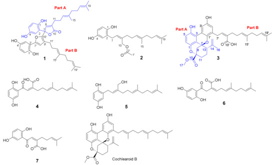 Ganoderma fungi (Ganodermataceae) have long been used as medicines in China, Japan and other Asian countries [1]. Pharmacological investigations revealed that Ganoderma extracts or compounds possess antitumor [2], immunomodulatory [3], antioxidant [4], and anti-inflammatory properties [5]. Mounting chemical investigations have been underwent on Ganoderma in the past decades which mainly focused on the isolation of triterpeniods and polysaccharides. In 2013, we identified a pair of novel meroterpenoids named lingzhiols with a 5/5/6/6 ring system from Ganoderma lucidum as a p-Smad3 inhibitor [6], which received great attention in the related scientific community. So far, more than 150 Ganoderma meroterpenoids have been reported from Ganoderma species, of which more than two thirds were characterized by us. These structurally diverse meroterpenoids were disclosed to have anti-fibrotic [7,8], neuroprotective [9], antiinflammatory, and antioxidant properties [10,11,12,13,14,15,16]. As a continuation of our research on Ganoderma species, Ganoderma cochlear was investigated which resulted in the isolation of cochlearines A and B, cochlearoids A–K [8,16], cochlearols A and B [17], and ganocochlearines C–I [18]. These findings inspired us to conduct an additional investigation on this fungus, which therefore led to the isolation of new meroterpenoids, gancochlearol C (1), cochlearoid Q (3), and gancochlearol D (2), together with four known ones, ganomycin C (4), ganomycin F (5), cochlearol D (6), and fornicin D (7). In this paper, we describe their isolation, structural elucidation as well as biological activities toward human lung cancer cells (H1975, PC9, A549) and N-acetyltransferase.