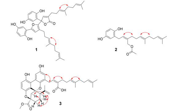 Key 1H-1H COSY and HMBC correlations for (1–3).
