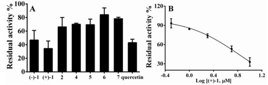 Arylamine N-acetyltransferase (NAT) was reported to be related with synthesis of mycolic acids and complex lipids in Mycobacterium bovis, which makes NAT a novel drug target for tuberculosis [24]. With this, all the isolates except for compounds (+)-3 and (−)-3 were tested for their inhibitory activity toward the recombinant NAT2 isoform. It was found that (+)-1 and (−)-1 could inhibit NAT2 at 10 μM, and (+)-1 is more potent than quercetin, which was the positive control used in this study. Based on this observation, a subsequent experiment was carried out to reveal that (+)-1 has an IC50 value of 5.29 ± 0.10 μM toward NAT2 (Figure 4).