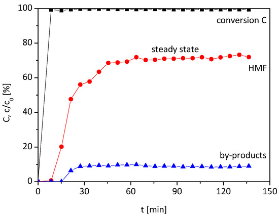 As already mentioned, our preliminary study [14] of the synthesis of HMF from fructose in HFIP with the heterogeneous catalyst Lewatit K2420 in a batch reactor showed a high yield. As consequence of this study, a fixed bed reactor based on Lewatit K2420 as a catalyst bed was designed (see Figure 6 in Section 3.1). A fructose/HFIP/water solution was pumped through the reactor and samples were taken, which resulted in the following reaction course (Figure 1).