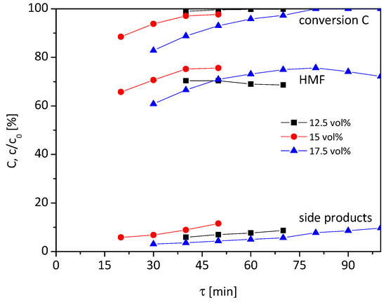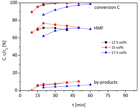 For the 17.5 vol% water content (blue triangles), the course of the graph is similar to 15 vol%. At the low residence time of 30 min, a conversion rate of 83% is reached, with 61% HMF yield and 3% yield of by-products. When extending τ to 80 min, a full conversion and maximum HMF yield of 76% are achieved, whilst 8% by-products are formed. With further prolonging of τ, the yield of HMF drops again and by-product formation increases, which lowers the selectivity.