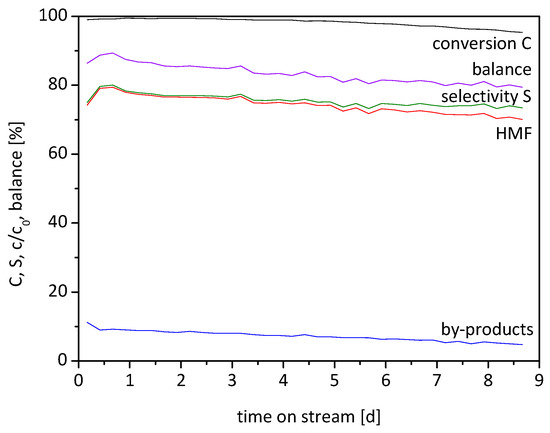 During the first hours, the yield of HMF increases from 74 to 80% at nearly complete conversion. After 8.7 days, the yield and conversion decrease gradually over time to 70% and 95%, respectively. During this time the selectivity of the HMF formation drops from 80 to 74%, which implies that the selectivity is less influenced by catalyst deactivation than the yield of HMF. The integration of the HMF curve equals an overall yield of 26.6 g or 74% HMF in those 8.7 days. The balance drops over time as well, which may be explained by adsorbed humins on the catalyst surface, which can react with HMF because of reactive functional groups. It is also conceivable that the catalyst pores become clogged by adsorbed humins, which worsens the active site accessibility and diffusion in and out of the pores. Also, leaching of acid sites is possible.