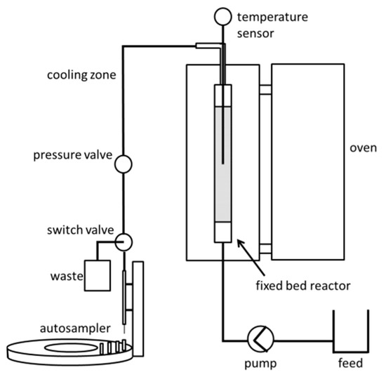 The fixed bed reactor (Figure 6) embedded in the reactor oven (HTM-Reetz LK 500-40-400-1, Berlin, Germany) consists of a 15 cm × 0.95 cm (inner diameter) stainless steel tube (technical useful volume 6 mL), a catalyst bed of 1.7 g Lewatit K2420 (dry matter, measured by Ohaus MB45, Parsippani, NJ, USA), which is fixated by glass wool at the outlet and a frit at the inlet, as well as a Pt100 thermistor in the middle of the bed. The feed consisting of HFIP, fructose and water is pumped via an HPLC-pump (Knauer Smartline Pump 100, Berlin, Germany) through a 0.16 cm (inner diameter) PTFE pipe into the fixed bed reactor. At the reactor outlet, a 50 cm × 0.16 cm (inner diameter) PTFE pipe is connected, which acts as a cooling zone. To avoid vaporization of reaction solution, a pressure valve (Swagelok KCB Series, Solon, OH, USA) at the end of the cooling zone keeps the complete reactor setup at 20 bar pressure. Samples were taken with an autosampler (HiTec Zang, AutoSam 360, Herzogenrath, Germany) after the pressure valve.