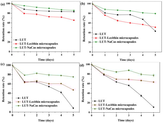 The stability of microcapsules during manufacture, transport, storage and utilization is critical for their practical application [13]. Any changes in storage temperature may influence the stability of particles through numerous mechanisms. High temperature causes conformational changes of any emulsifier molecules adsorbed to the droplet surfaces, which is able to alter their ability to stabilize the droplets against aggregation [31]. However, this effect is less important for flexible proteins such as sodium caseinate. From Figure 2 it can be seen after storage for 5 days, the retention rate of lutein in natural lutein crystal and lutein-loaded NaCas powders was over 80% (82.90% for lutein and 86.01% for lutein-loaded NaCas powders), while its retention rate in lutein-loaded lecithin microcapsules was 65.13% at 4 °C (Figure 2a). In addition, the lutein retention rate of natural lutein crystal was declined dramatically to 43.19% on the fifth day at 25 °C and dropped to 8.36% at 37 °C (Figure 2b,c), while its retention rate in lutein-loaded NaCas powder was 79.83% at 25 °C (Figure 2b); and 75.02% at 37 °C on the fifth day (Figure 2c). It could be found that the redispersion of lutein-NaCas microcapsules was relatively stable to thermal processing. Different treatments showed significant differences on retention rate (Figure 2). The research by Darewicz and O’Kennedy [32,33]. suggested sodium caseinate was a pretty flexible and disordered protein, and therefore it was less likely to change through hydrophobic attraction or disulfide bonds. Yet, lutein-loaded lecithin powders exhibited poor storage stability, indicating that the egg yolk lecithin are inefficient emulsifiers for lutein encapsulation due to the changes in membrane composition during storage [34].