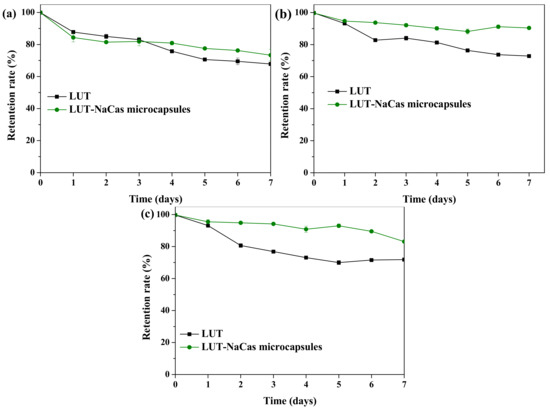Effect of storage pH values (a) pH 2; (b) pH 5; (c) pH 7 on the retention rate of lutein (LUT) in its natural form and lutein-enriched microcapsules stabilized by sodium caseinate after 7 days of storage. Data points represent means (n = 3) ± standard deviations. Some error bars lie within the data points.