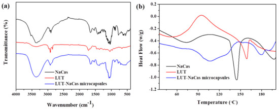 The characteristic transmittance of lutein crystal, NaCas and lutein-loaded NaCas microcapsules were measured by FTIR spectroscopy (Figure 4a). The protein bands of the amide I (1600–1700 cm−1) and amide II (1510–1530 cm−1) bands dominated the spectra. The strong transmittance of lutein was at 3415.82 cm−1, which was the O-H stretching vibrations mode, while this strongest transmittance shifted to 3413.90 cm−1 after encapsulated by NaCas, and the strongest transmittance of NaCas was at 3415.82 cm−1. The strong transmittance of lutein, NaCas and lutein-loaded NaCas microcapsules were at 1620.15 cm−1, 1618.23 cm−1 and 1639.44 cm−1 respectively. Interestingly, none of most bands of lutein were observed in the spectra of the lutein-loaded NaCas microcapsules, and there was no obvious difference in the FTIR spectra between NaCas and lutein-loaded NaCas microcapsules, implying that the entrapping procedure did not cause an obvious effect on the structural conformation of the proteins and this effect may due to the relatively low concentration of nutraceuticals or because of their interactions with the surrounding matrix [37], the encapsulation may have altered their electromagnetic absorption characteristics of lutein.